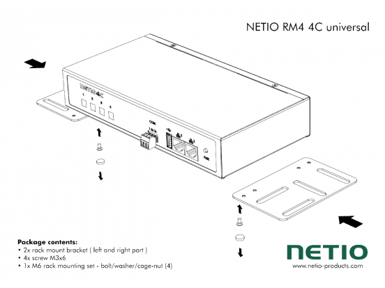 Metal brackets to install two NETIO4Cdevices into a 1U space in a 19” rack frame. The package includes M6 screws to fasten the devices in the 1U position.